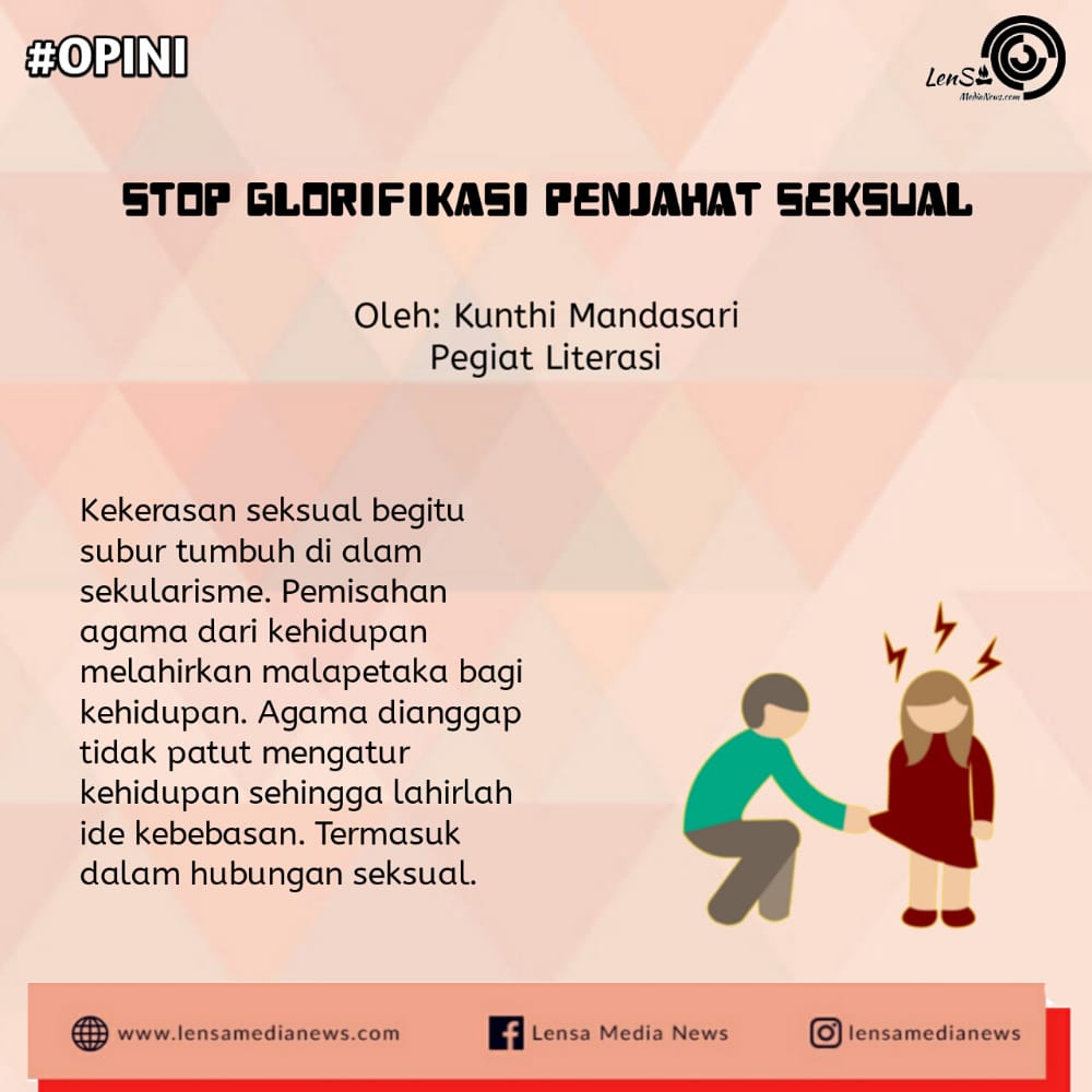 Kekerasan seksual begitu subur tumbuh di alam sekularisme. Pemisahan agama dari kehidupan melahirkan malapetaka bagi kehidupan. Agama dianggap tidak patut mengatur kehidupan sehingga lahirlah ide kebebasan. Termasuk dalam hubungan seksual.
