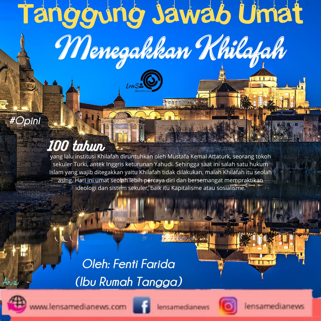 Lensamedia.com– 100 tahun yang lalu institusi Khilafah diruntuhkan oleh Mustafa Kemal Attaturk, seorang tokoh sekuler Turki, antek Inggris keturunan Yahudi. Sehingga saat ini salah satu hukum Islam yang wajib ditegakkan yaitu Khilafah tidak dilakukan, malah Khilafah itu seolah asing. Hari ini umat seolah lebih percaya diri dan bersemangat mempraktikan ideologi dan sistem sekuler, baik itu Kapitalisme atau sosialisme.
