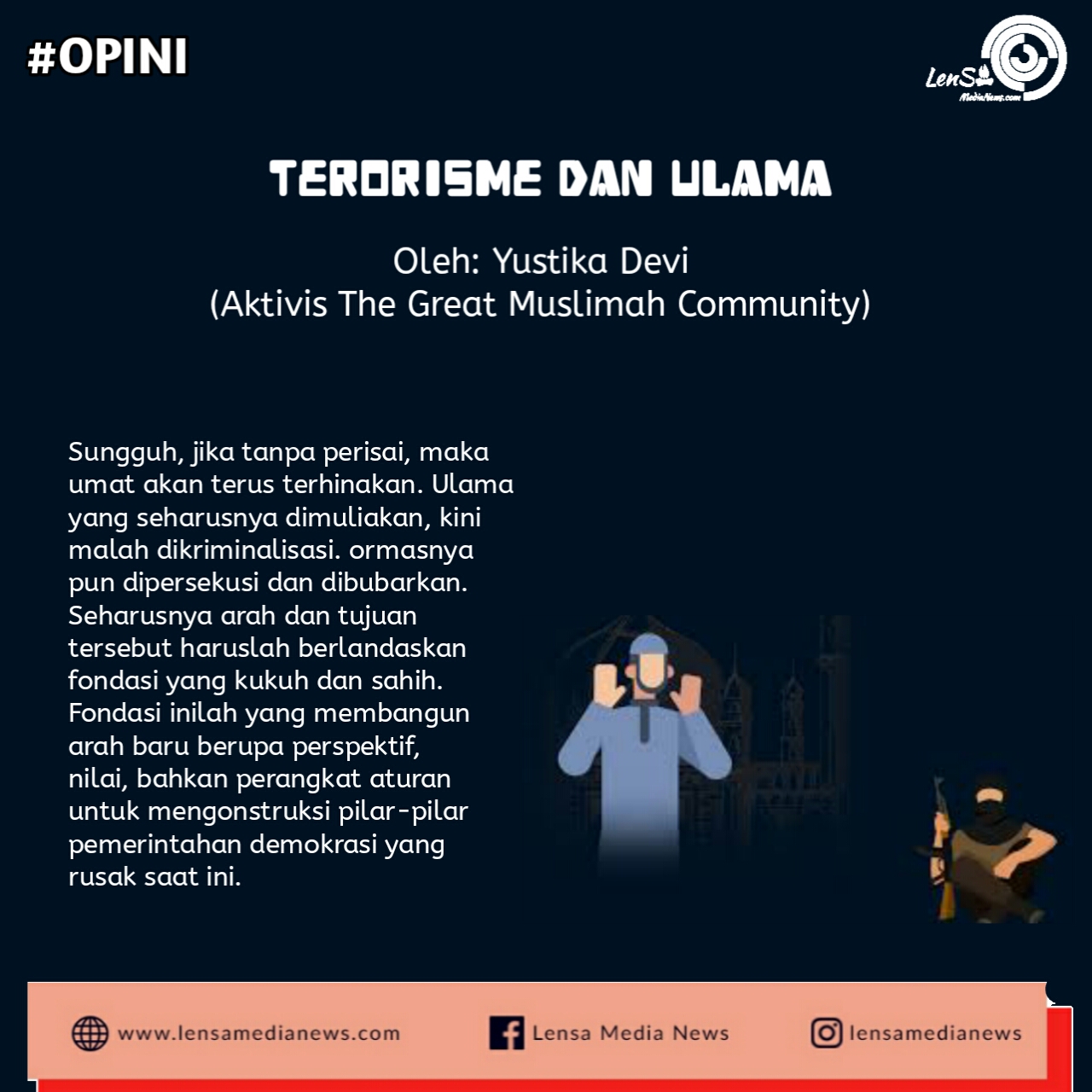 Sungguh, isu terorisme yang menyudutkan Islam dan para pemeluknya adalah satu alasan bagi kita untuk bersungguh-sungguh dalam berjuang mewujudkan kehidupan Islam. Agar Islam kembali menerangi kehidupan umat dan melindungi para ulama yang lantang menyuarakan kebenaran.