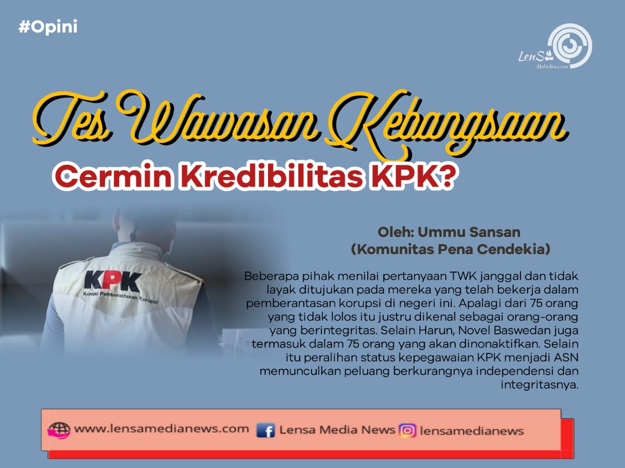 Lensa Media News – Absurd. Penilaian ini disampaikan oleh Kepala Satuan Tugas (Kasatgas) Penyelidik Komisi Pemberantasan Korupsi (KPK) Harun Al Rasyid tentang tes wawasan kebangsaan (TWK). Tes ini bagian dari proses alih status pegawai KPK menjadi ASN (Aparatur Sipil Negara). Harun sendiri merupakan Kasatgas Penyelidikan dalam operasi tangkap tangan (OTT) terhadap Bupati Nganjuk Novi Rahman Hidayat bersama Bareskrim Polri baru-baru ini. Namun, dia merupakan salah satu dari 75 pegawai KPK yang dinyatakan tidak memenuhi syarat atau tidak lolos TWK. (amp.kompas.com/14/5/2021).