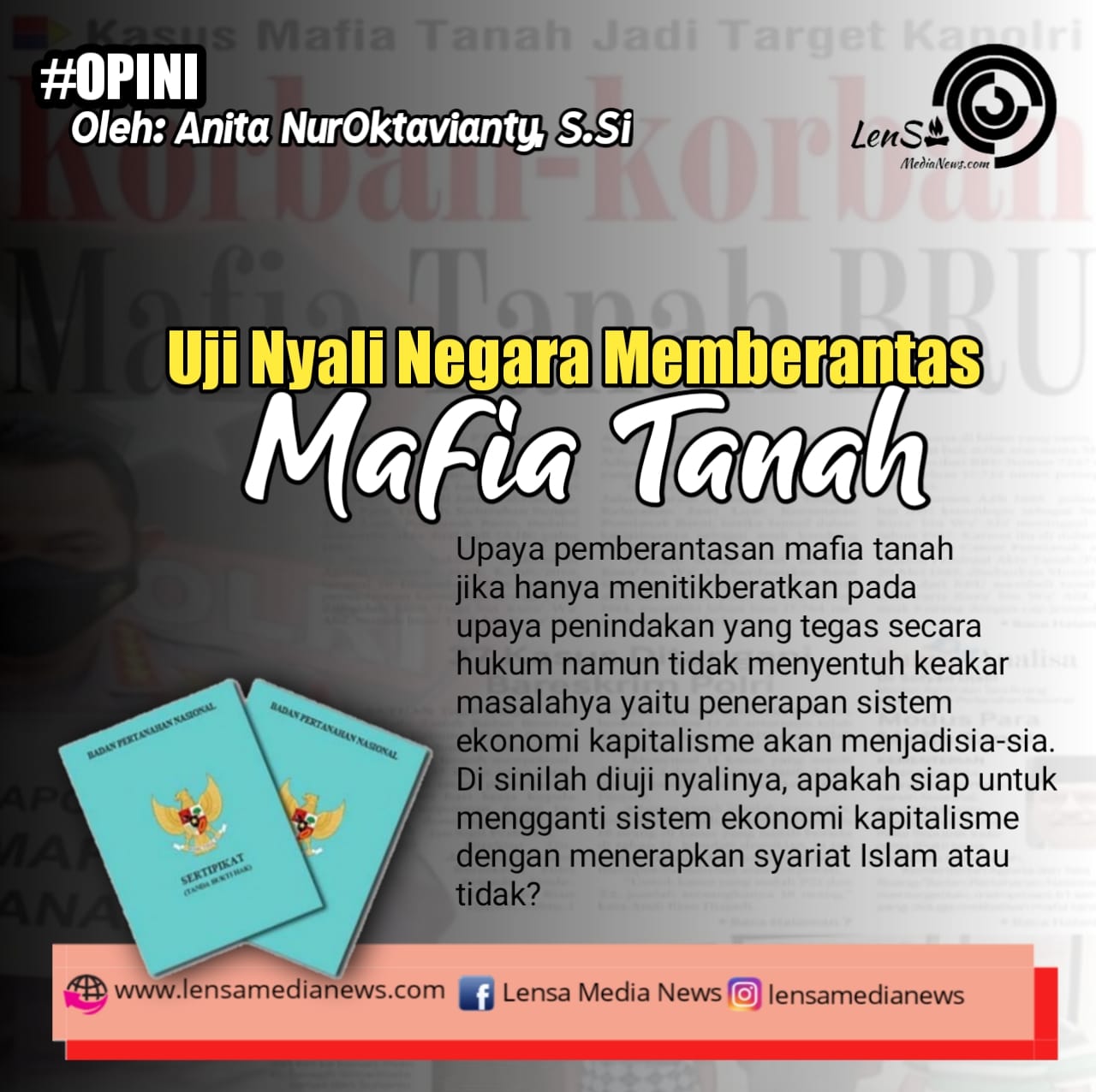 Dengan demikian upaya pemberantasan mafia tanah jika hanya menitikberatkan pada upaya penindakan yang tegas secara hukum namun tidak menyentuh ke akar masalahnya yaitu penerapan sistem ekonomi kapitalisme akan menjadi sia-sia. Di sinilah diuji nyalinya, apakah siap untuk mengganti sistem ekonomi kapitalisme dengan menerapkan syariat Islam atau tidak?