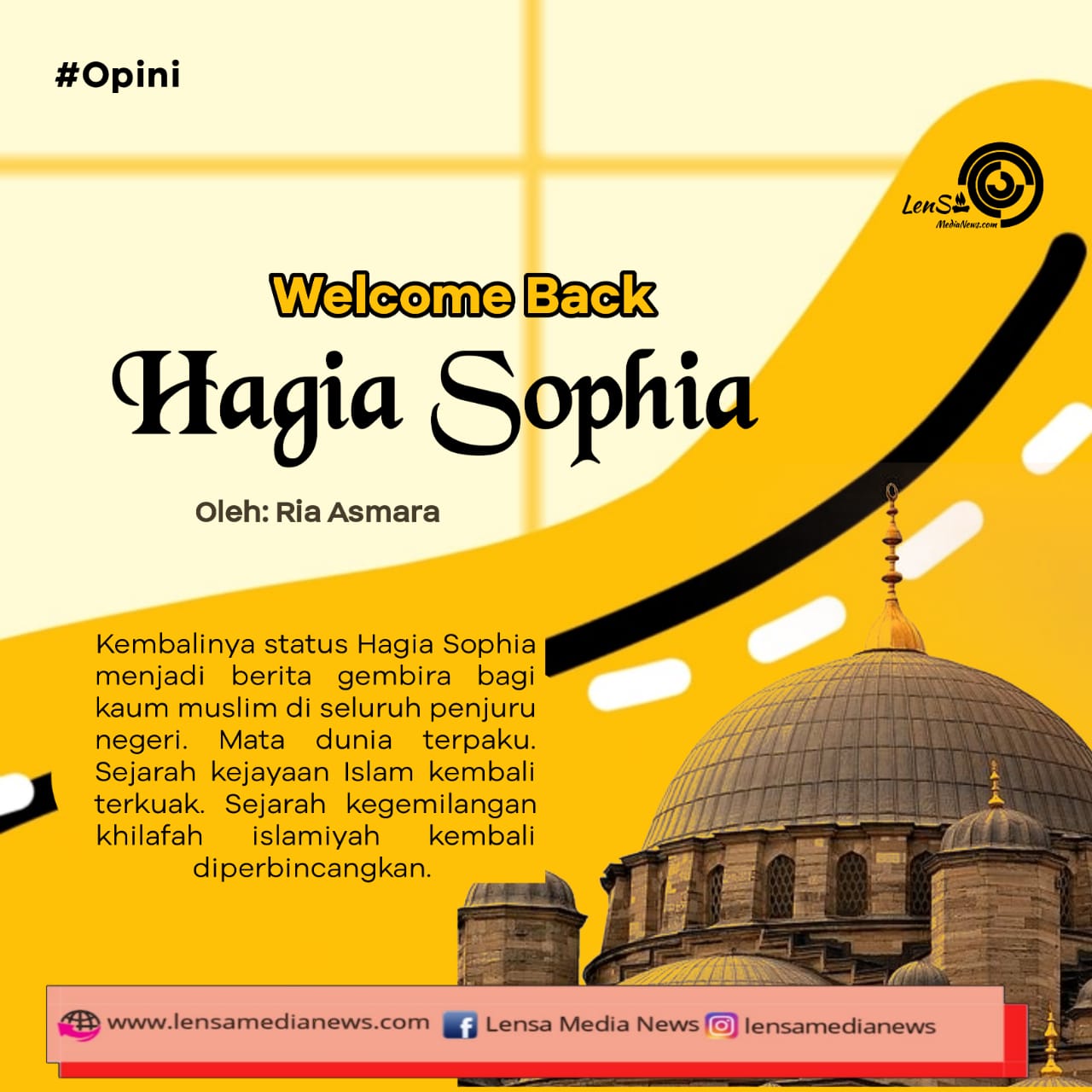 Kembalinya status Hagia Sophia menjadi berita gembira bagi kaum muslim di seluruh penjuru negeri. Mata dunia terpaku. Sejarah kejayaan Islam kembali terkuak. Sejarah kegemilangan khilafah Islamiyah kembali diperbincangkan. Kehebatan Muhammad Al Fatih sebagai pemimpin terbaik dari pasukan terbaik penakluk konstantinopel kembali diimpikan. Welcome back Hagia Sophia, kembalimu memompa semangat menjemput bisyarah kedua, menaklukkan Kota Roma.